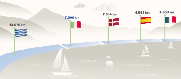 Il nostro Paese è secondo in UE per linea di costa, pari a circa 7.500 km¹, preceduta dalla Grecia (13.676 km) e seguita da Danimarca (7.314 km), Spagna (4.963 km) e Francia (4.853 km). Sardegna, Sicilia, Puglia e Calabria, insieme, rappresentano circa il 64% della linea di costa nazionale. Il litorale italiano nel suo complesso copre il 13% del totale europeo ed è il 14° più lungo a livello mondiale.² Per quanto riguarda la fascia costiera – che si estende fino a 10 km dalla costa e rappresenta una porzione importante del territorio nazionale – in Italia rappresenta il 22% del territorio.³ Guardando alla qualità delle acque di balneazione, in Italia 5.090 km di tratti marini (il 95,7% della costa monitorata) sono inseriti nella classe di qualità “eccellente” (2024).³