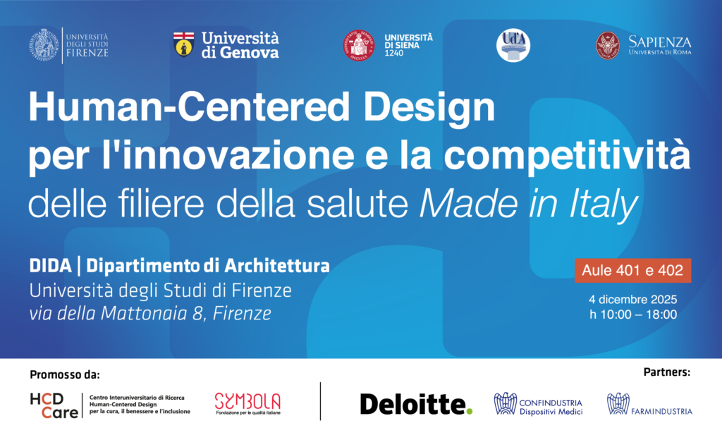 Il 4 dicembre alle ore 9:30, presso l'Università degli Studi di Firenze sarà presentato il nuovo Centro interuniversitario HCD-Care fondato dagli atenei di Firenze, Genova, Chieti-Pescara, Siena e Roma La Sapienza, con sede presso l’Università di Firenze e il primo Master interuniversitario in Design per la Salute, un’iniziativa senza precedenti nel panorama nazionale promosso da HCD-Care e Fondazione Symbola con Confindustria Dispositivi Medici, Farmindustria e Deloitte. Il percorso coinvolgerà aziende dei settori medicale, farmaceutico e biotech, oltre a studi di progettazione attivi nel campo del design per la cura e l’assistenza.