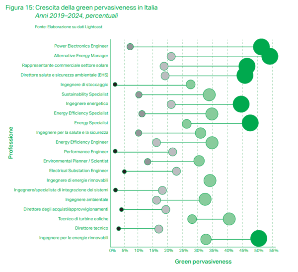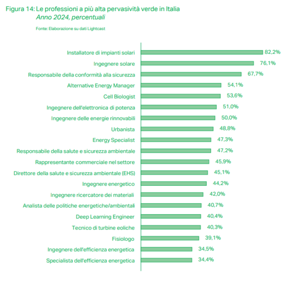 Queste professioni disegnano un percorso completo della transizione ecologica: dagli impianti fotovoltaici che si moltiplicano sui tetti delle nostre città, ai sistemi ingegneristici che ne massimizzano l’efficienza, dai processi industriali resi più conformi e trasparenti fino alla pianificazione urbana che integra energia, mobilità e sostenibilità sociale. È una catena del valore in cui ogni anello è indispensabile, e che mostra come il lavoro verde non sia confinato a singole figure specialistiche, ma costituisca un ecosistema professionale che plasma il futuro dell’Italia (fig 14).