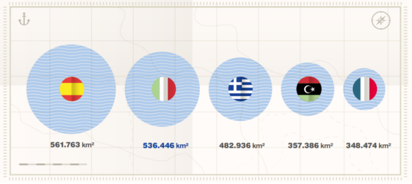 Con 536.446 km² l’Italia è seconda nel Mediterraneo per spazio marittimo, preceduta da Spagna (561.763 km²), e seguita da Grecia (482.936 km²), Libia (357.386 km²), Francia (348.474 km²). Un’area tra le più ricche di biodiversità del Mare nostrum, con piattaforme continentali poco profonde, canyon sottomarini e monti marini, vere e proprie autostrade per cetacei e grandi pesci pelagici.